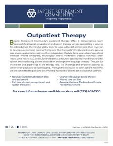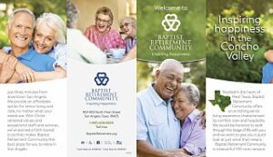 Baptist Retirement Community, a Buckner Retirement Services senior living community, is a faith-based nonprofit community located on a 100-acre campus in San Angelo. The Life Plan community offers independent living, skilled or long-term nursing, memory care assisted living, personal assistance program and outpatient therapy. Residents have access to on-site amenities such as a pharmacy, health clinic, chapel, beauty salons, a restaurant and fitness centers. Buckner Retirement Services is part of Buckner International, a ministry founded in 1879 in Texas, which today serves people in the United States and internationally through a variety of programs designed to protect children, strengthen families, transform generations and serve seniors. Buckner also provides humanitarian aid and crisis relief to poverty-stricken children and families. Visit BaptistRetirement.org to learn more or get involved.