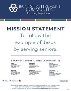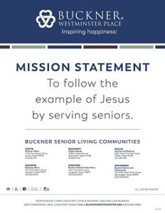 Buckner Retirement Services is one of the largest not-for-profit senior living providers in Texas. Dedicated to Inspiring happiness®, BRS enhances the quality of life for senior adults and their families by promoting an active, healthy Christian lifestyle while maintaining their independence and dignity. BRS is part of Buckner International, a faith-based ministry serving more than 350,000 people each year in Texas and six countries worldwide. Visit BucknerRetirement.org to learn more.