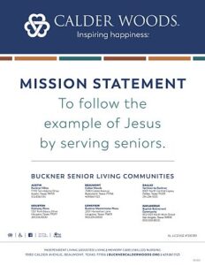 Located in Beaumont’s growing west end, Calder Woods is a 17-acre community providing a vibrant lifestyle where residents have everything they need – and want – at their fingertips. As Beaumont’s only faith-based, nonprofit Life Plan Community, Calder Woods offers a full continuum of care on site, so residents can have the peace of mind knowing their address can remain the same despite changing medical needs. Residents at Calder Woods have the opportunity to engage with like-minded friends and neighbors at various lifestyle programs, events and outings, as they exercise, laugh, dine and join in fellowship each day. Calder Woods is owned and operated by Buckner Retirement Services, part of faith-based nonprofit Buckner International, which has served children, families and seniors across Texas and internationally for 144 years. Visit BucknerCalderWoods.org to learn more.
