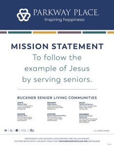 Located in the heart of Houston’s Energy Corridor, Buckner Parkway Place is a 15-acre community serving senior adults with the highest level of hospitality and care. Parkway Place offers a complete continuum of living and care on-site, so residents can have the peace of mind knowing their address can remain the same despite changing medical needs. Residents receive the best possible care and experiences, giving them opportunities to thrive by enjoying active, independent and dynamic lifestyles based on their interests and abilities. Each resident has the opportunity to engage in a variety of experiences throughout the day, including lifestyle programs, events and outings. Parkway Place is owned and operated by Buckner Retirement Services, part of faith-based nonprofit Buckner International, which has served children, families and seniors across Texas and internationally since 1879. Visit BucknerParkwayPlace.org to learn more.