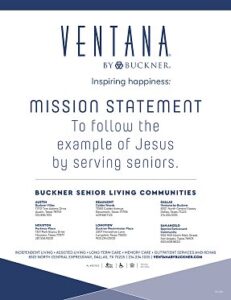 Ventana by Buckner is an exclusive high-rise Life Care retirement community in North Dallas. Ventana offers an independent lifestyle filled with activities and experiences, whether traveling with friends, exercising at the state-of-the-art fitness center or having a 5-star dining experience in one of the six dining venues. Its adjacent 12-story towers include one-, two- and three-bedroom independent living apartment options that range from 950 to 2,000 square feet. Ventana includes the full continuum of care for Members with assisted living, memory care, long-term care and rehabilitation. Ventana by Buckner is owned and operated by Buckner Senior Living, part of faith-based nonprofit Buckner International, which has served children, families and seniors in Dallas and across Texas and internationally since 1879. Visit VentanaByBuckner.com to learn more.