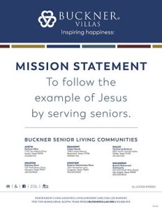Buckner Villas, a Buckner Retirement Services senior living community, is a faith-based nonprofit community located on a 25-acre campus in North Austin. The community offers a variety of living options, spacious apartment floor plans and villas with a flexible and affordable fee structure. As a continuing care community, Buckner Villas accommodates all needs by making sure everyone’s level of required care is met by offering independent and assisted living services, memory care and skilled nursing care. Buckner Retirement Services is part of Buckner International, a ministry founded in 1879 in Texas, which today serves people in the United States and internationally through a variety of programs designed to protect children, strengthen families, transform generations and serve seniors. Buckner also provides humanitarian aid and crisis relief to poverty-stricken children and families. Visit BucknerVillas.org to learn more or get involved.