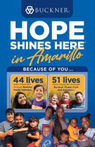 Buckner Amarillo is a faith-based nonprofit ministry dedicated to transforming the lives of vulnerable children, families and senior adults. Buckner Amarillo is an extension of Buckner International, which was founded in 1879 in Texas and today serves people in the United States and internationally through a variety of programs designed to protect children, strengthen families, transform generations and serve seniors. These programs include foster care and adoption, family transition programs, community-based family preservation programs and retirement services for senior adults. Buckner also provides humanitarian aid and crisis relief to poverty-stricken children and families. Visit Buckner.org/Amarillo to learn more or get involved.