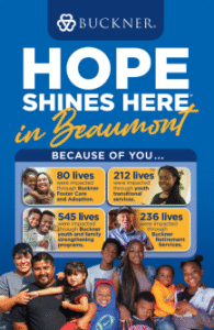Buckner Southeast Texas is a faith-based nonprofit ministry dedicated to transforming the lives of vulnerable children, families and senior adults in Beaumont and the Golden Triangle area. Buckner Southeast Texas is an extension of Buckner International, which was founded in 1879 in Texas and today serves people in the United States and internationally through a variety of programs designed to protect children, strengthen families, transform generations and serve seniors. These programs include foster care and adoption, family transition programs, community-based family preservation programs and retirement services for senior adults. Buckner also provides humanitarian aid and crisis relief to poverty-stricken children and families. Visit Buckner.org/Beaumont. to learn more or get involved