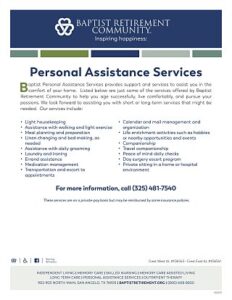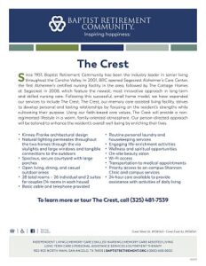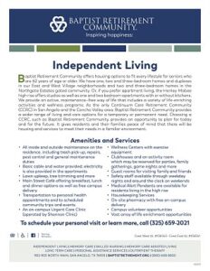 Baptist Retirement Community, a Buckner Retirement Services senior living community, is a faith-based nonprofit community located on a 100-acre campus in the heart of San Angelo. The Life Plan community offers independent living, skilled or long-term nursing, memory care assisted living, personal assistance program and outpatient therapy. Residents have access to on-site amenities such as a pharmacy, health clinic, chapel, beauty salons, a restaurant and fitness centers. Baptist Retirement Community is part of Buckner International, a ministry founded in 1879 in Texas, which today serves people in the United States and internationally through a variety of programs designed to protect children, strenghten families, transform generations and serve seniors. Visit BaptistRetirement.org to learn more or get involved.