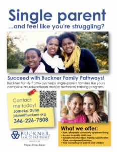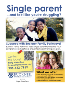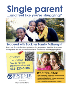 Buckner Family Pathways® programs are designed to transform generations though supporting single parents and reducing barriers to self-sufficiency such as lack of education and life skills. An integral service of nonprofit Buckner International, Family Pathways protects single parents who may suffer from domestic abuse, financial uncertainty, homelessness and hopelessness by providing housing, access to child care assistance and a variety of other services aligning with the mission of Buckner. Family Pathways programs equip families with the tools they need to reach their goals and form strong bonds. Visit Buckner.org/Family-Pathways to learn more or get involved.