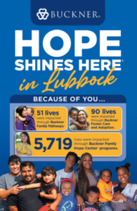 Buckner Lubbock is a faith-based nonprofit ministry dedicated to transforming the lives of vulnerable children, families and senior adults. Buckner Lubbock is an extension of Buckner International, which was founded in 1879 in Texas and today serves people in the United States and internationally through a variety of programs designed to protect children, strengthen families, transform generations and serve seniors. These programs include foster care and adoption, family transition programs, community-based family preservation programs and retirement services for senior adults. Buckner also provides humanitarian aid and crisis relief to poverty-stricken children and families. Visit Buckner.org/Lubbock to learn more or get involved.