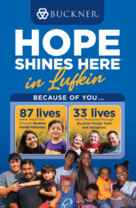 Buckner Lufkin is a faith-based nonprofit ministry dedicated to transforming the lives of vulnerable children, families and senior adults in East Texas. Buckner Lufkin is an extension of Buckner International, which was founded in 1879 in Texas and today serves people in the United States and internationally through a variety of programs designed to protect children, strengthen families, transform generations and serve seniors. These programs include foster care and adoption, family transition programs, community-based family preservation programs and retirement services for senior adults. Buckner also provides humanitarian aid and crisis relief to poverty-stricken children and families. Visit Buckner.org/Lufkin to learn more or get involved.