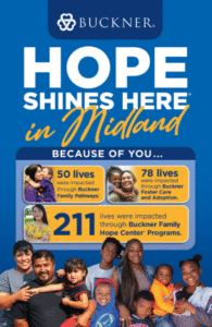 Buckner Midland is a faith-based nonprofit ministry dedicated to transforming the lives of vulnerable children, families and senior adults in the Permian Basin. Buckner Midland is an extension of Buckner International, which was founded in 1879 in Texas and today serves people in the United States and internationally through a variety of programs designed to protect children, strengthen families, transform generations and serve seniors. These programs include foster care and adoption, family transition programs, community-based family preservation programs and retirement services for senior adults. Buckner also provides humanitarian aid and crisis relief to poverty-stricken children and families. Visit Buckner.org/Midland to learn more or get involved.