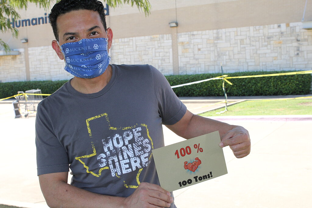 The big milestone was marked by a small ceremony on Thursday in Dallas, where the 10 Buckner employees who were primarily responsible for managing the shipments received commemorative pins reading, “100% through 100 tons.”