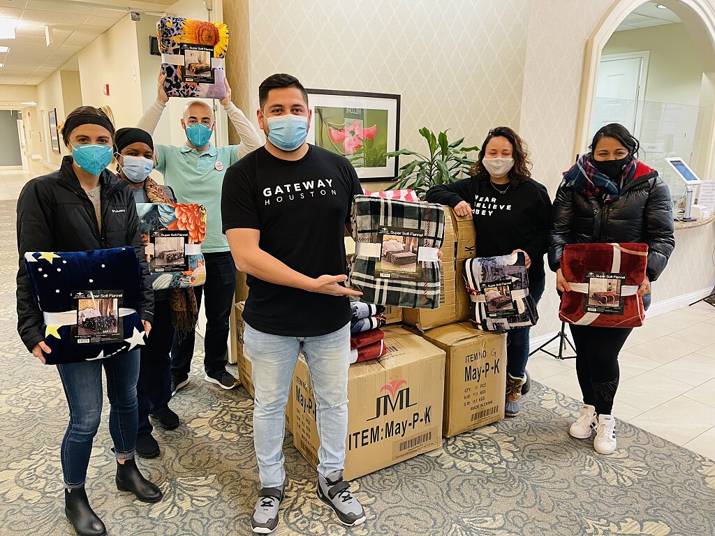 La iglesia Gateway Church Houston también llevó 100 cobijas para regalar a los adultos mayores de Parkway Place. Con las temperaturas inusualmente frías que ha traído esta tormenta invernal, las cobijas adicionales son un apreciado extra de calidez durante estos días fríos.