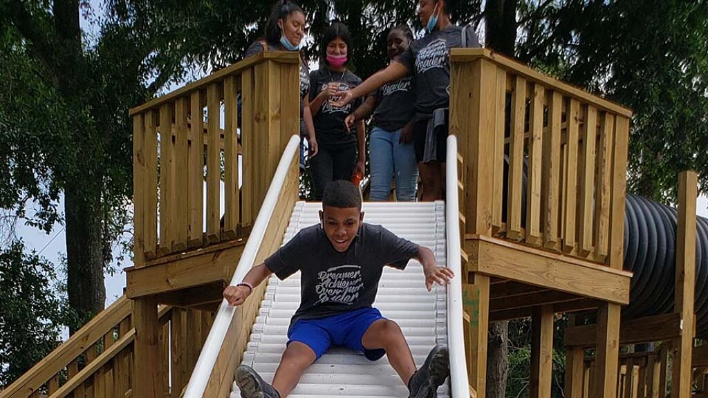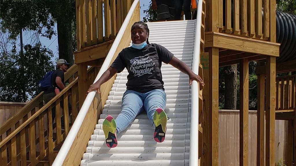 El día era perfecto para una aventura al aire libre y, después de disfrutar de un almuerzo en el jardín, los adolescentes se turnaron para deslizarse por el gran tobogán texturizado, lo que provocó muchas risas y carcajadas.