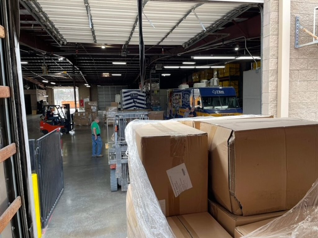 Un bénévole de Texas Baptist Men décharge une palette de couvertures destinées à la Syrie après les tremblements de terre meurtriers qui ont frappé ce pays et la Turquie en février.