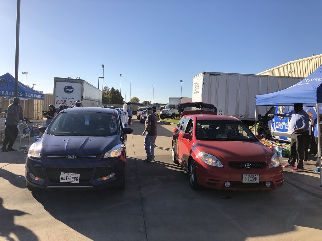 Au Centre Buckner pour l'aide humanitaire, Les légendes des Dallas Mavericks, Cedric Ceballos et Erick Strickland, ont aidé à distribuer des repas complets pour Thanksgiving, en partenariat avec Kroger, comprenant une dinde, de la farce, des légumes, un mélange pour gâteau et bien plus encore, à 200 familles prises en charge par Buckner.