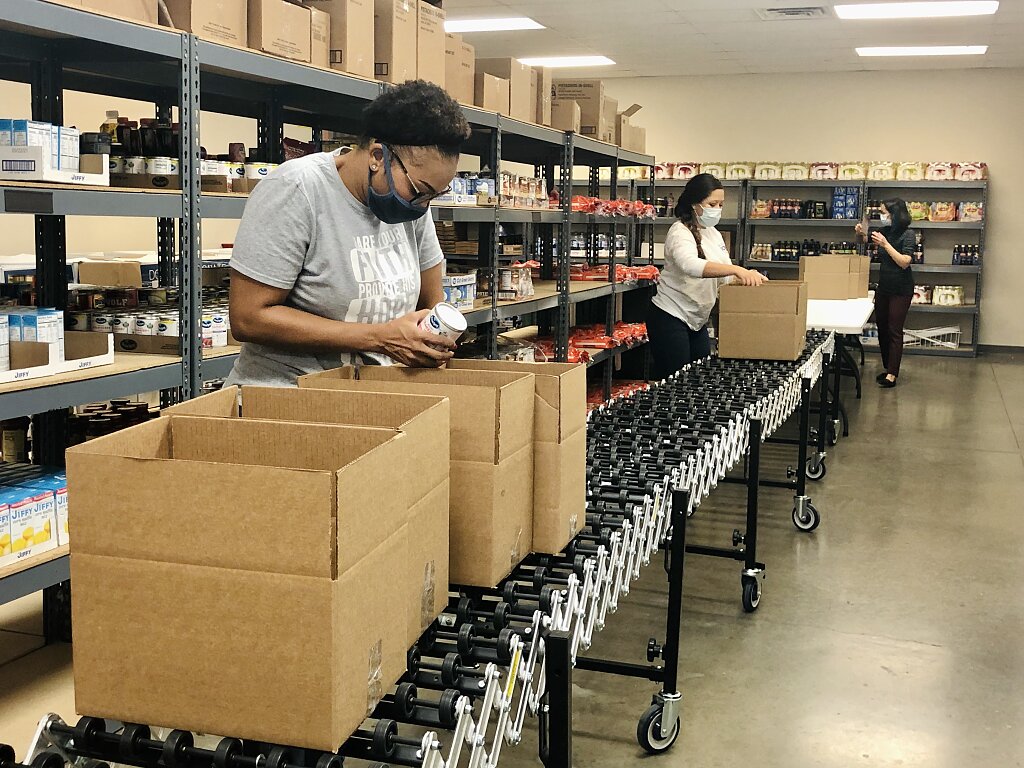 Le personnel du Family Hope Center a travaillé au Buckner Center for Humanitarian Aid pour emballer des boîtes remplies d'accompagnements et de petits pains fournis par Aramark afin de garnir les tables des familles pour Thanksgiving.