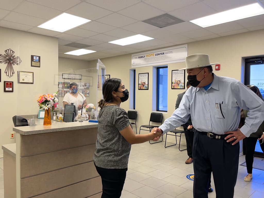 Après la cérémonie d'inauguration, le sénateur Hinojosa s'est entretenu avec le personnel et les clients de Buckner afin d'en savoir plus sur la manière dont le Family Hope Center renforce les familles dans le district 20.