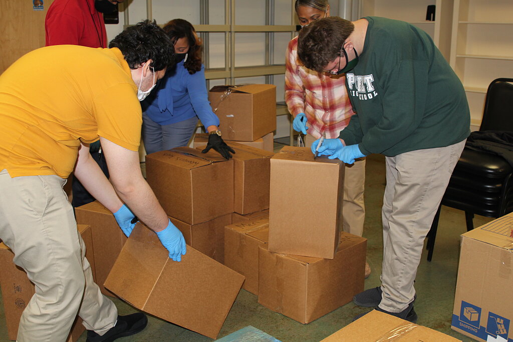 Des étudiants se portent volontaires pour emballer en toute sécurité des aides humanitaires destinées aux familles vulnérables.