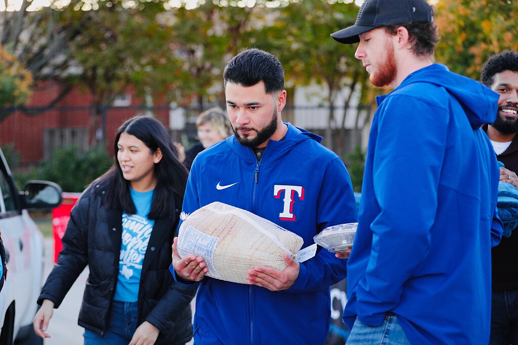 La semaine dernière, plusieurs joueurs des Texas Rangers se sont rendus à la Texas Rangers Youth Academy pour distribuer des dindes et des accompagnements de Thanksgiving à des centaines de familles de West Dallas. Photo gracieusement fournie par les Texas Rangers.