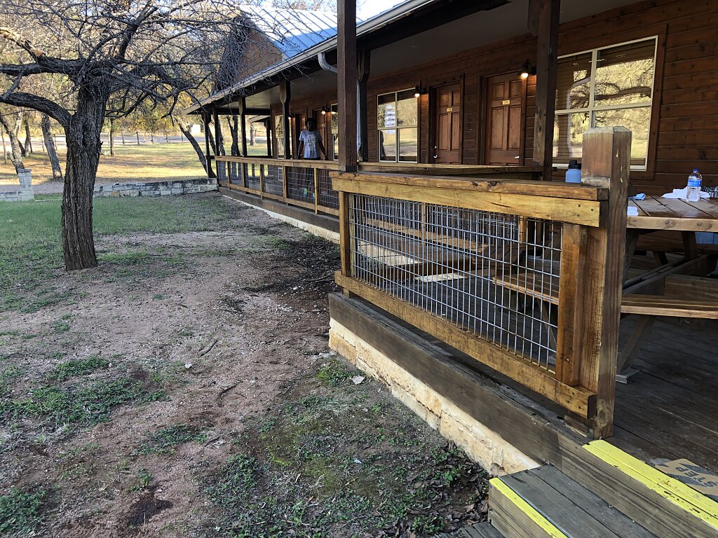 Faith Hall, la principale salle de conférence du Camp Buckner, a fait peau neuve avec de nouvelles balustrades en bois et des panneaux métalliques. Cela a permis d'ouvrir la vue depuis la terrasse sur la campagne vallonnée, tout en ajoutant des places assises supplémentaires.